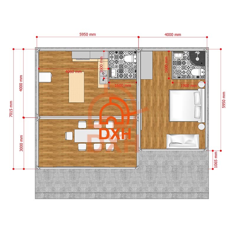 Factory-Built · Fully Furnished Layout · CE & ISO 9001 Certified · Ships Worldwide Looking for an affordable, fast-build one-bedroom container home? This one-bedroom prefab container home is a fully flat-pack single-container house featuring an open-plan kitchen and living area, a private bedroom with integrated bathroom, and a spacious dining zone — all factory-built to CE and ISO 9001 standards. This floor plan measures 9,950 mm × 7,015 mm and consists of standard container modules combined to form a fully functional, self-contained home. Each unit is more than complete upon leaving the factory, which means your on-site assembly time will be reduced from months to days.